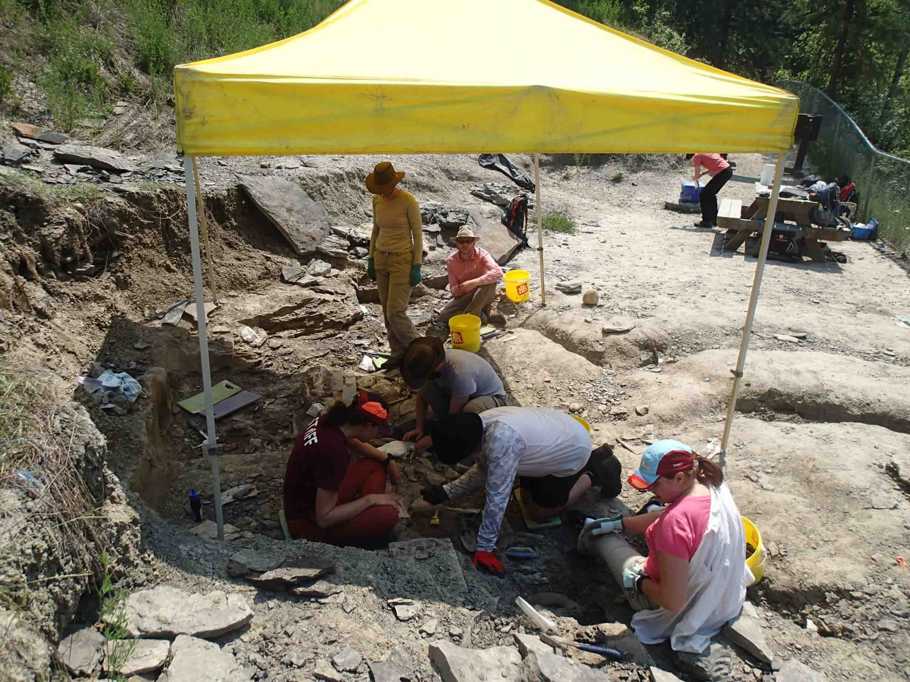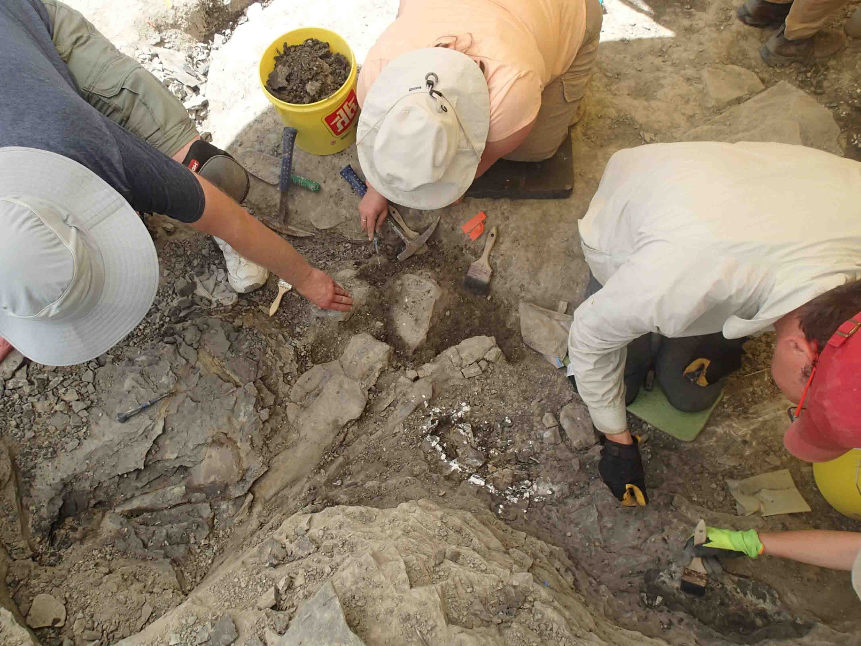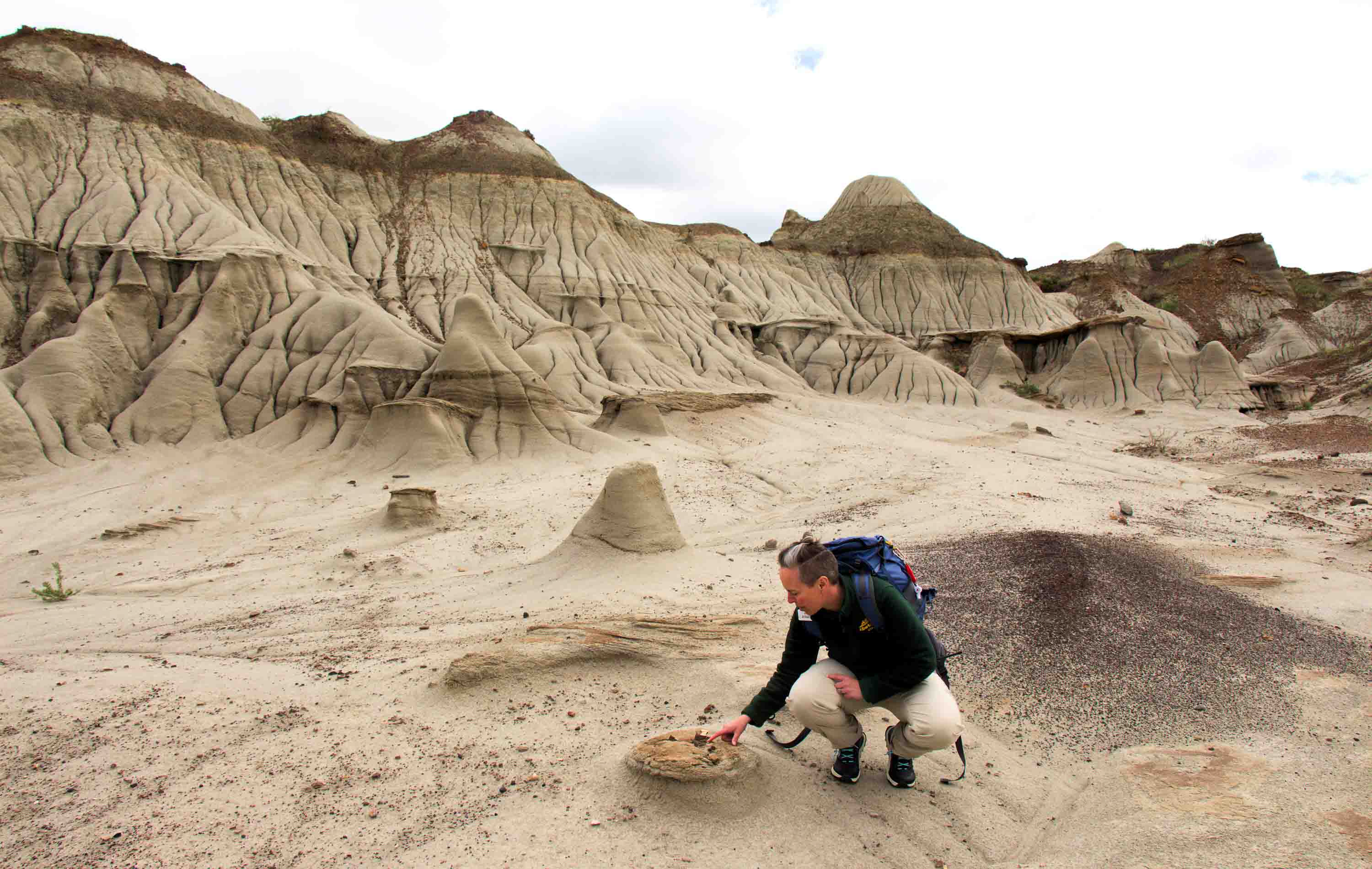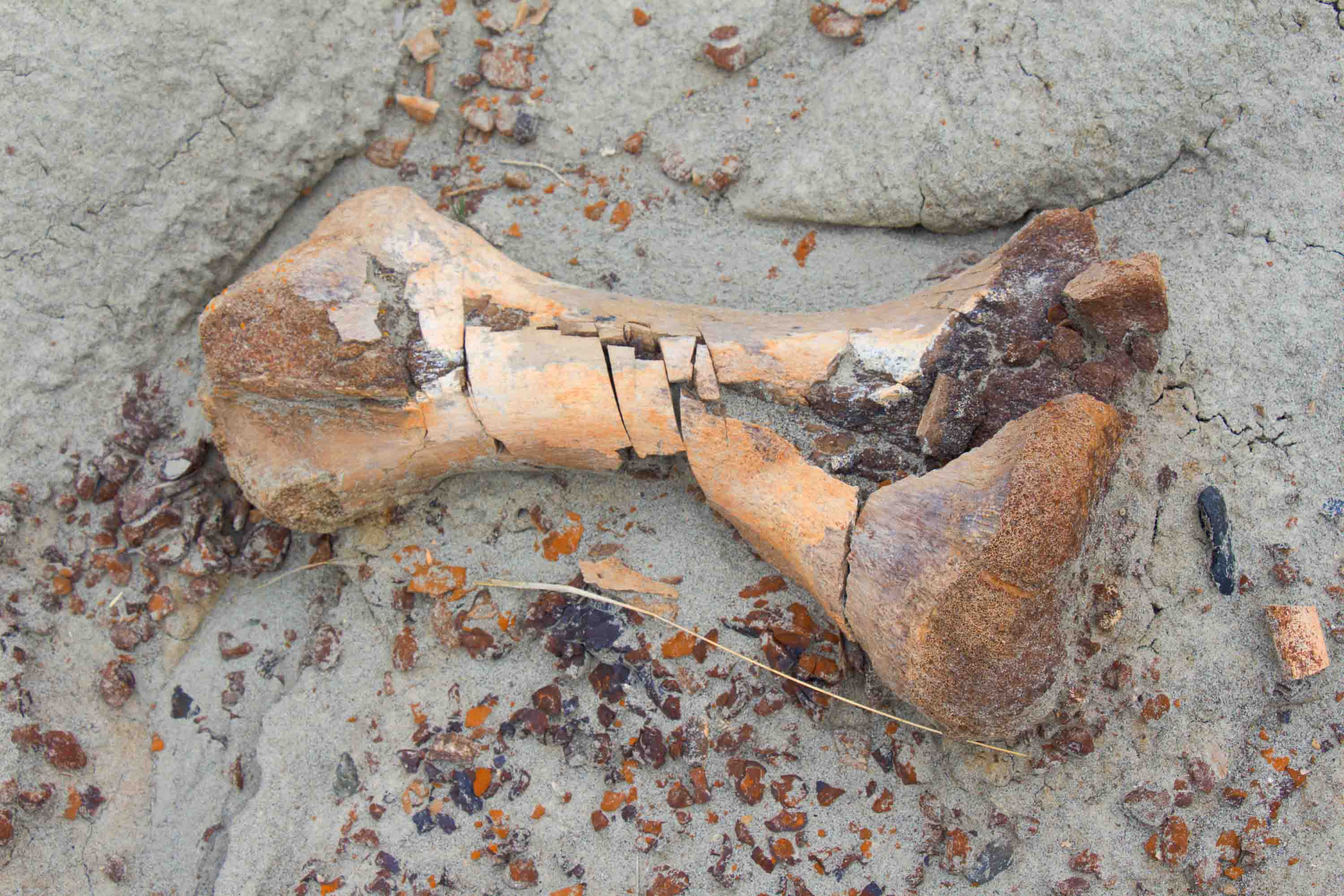 Experts believe some sort of catastrophic event, probably a flood, at Pipestone Creek wiped out an enormous Pachyrhinosaurus herd who were most likely on a seasonal migration. Later, a second flood swept up all the bones and channeled them into a big jumble—a “Pachyrhinosaurus omelet,” as Dr. Emily Bamforth, curator and paleontologist at the Currie Museum, describes it.