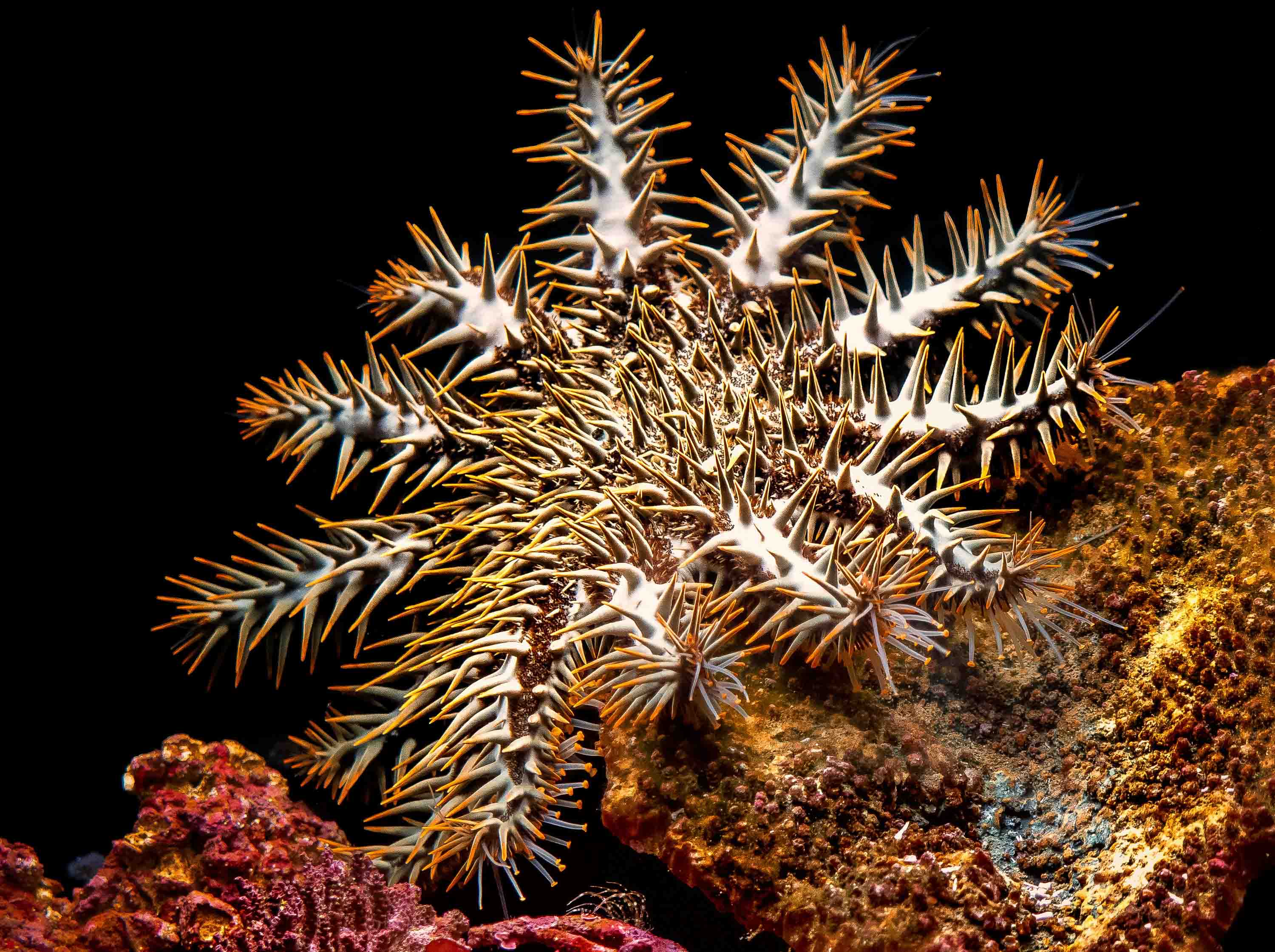 I snorkel a short swim away back to Bowden-Kerby who is hovering above the main Great Sea Reef—this is where the flourishing coral from the BULA Reef nursery is eventually transplanted once its deemed healthy enough to survive on its own. Bowden-Kerby is intent on smashing a crown-of-thorns starfish—which looks part-Australian echidna and part-tumbleweed—with old coral, to destroy his underwater nemesis.